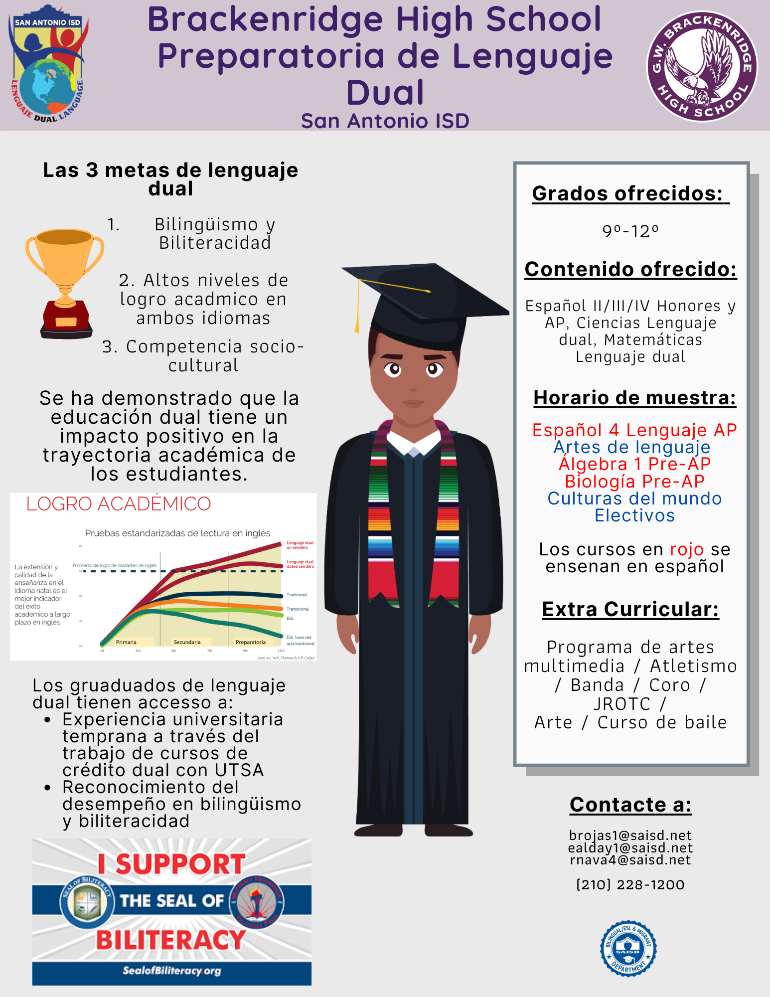 Brackenridge se enorgullece de ser la única escuela preparatoria integral con calificación “B” en SAISD, un lugar donde los estudiantes lideran, logran logros y brillan a través de la excelencia académica, la innovación y el orgullo comunitario.