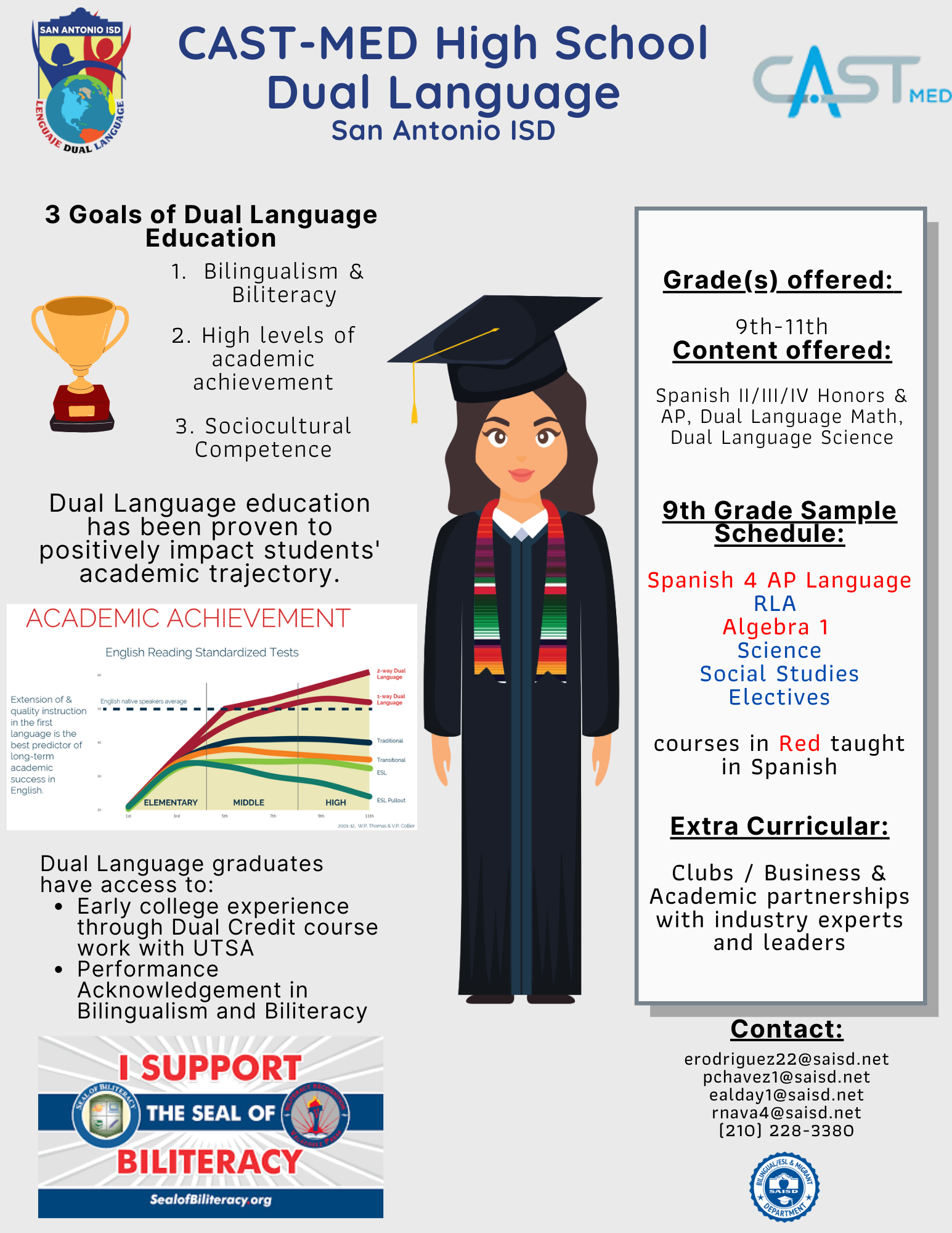 En CAST Med High School aportamos a la fuente de doctores, enfermeros, farmacéuticos, dentistas e investigadores que tanto se necesitan en el área de San Antonio con estudiantes que desean mejorar la salud de nuestra comunidad. Ofrecemos un énfasis en la medicina y la investigación biomédica.