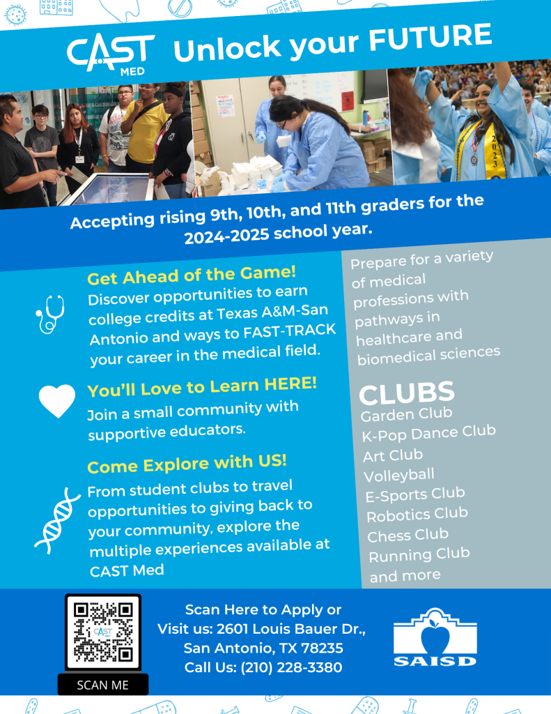 At CAST Med High School, we add to the pipeline of much-needed doctors, nurses, pharmacists, dentists, and researchers in the San Antonio area with students wishing to improve the health of our community. We offer an emphasis on medicine and biomedical research.