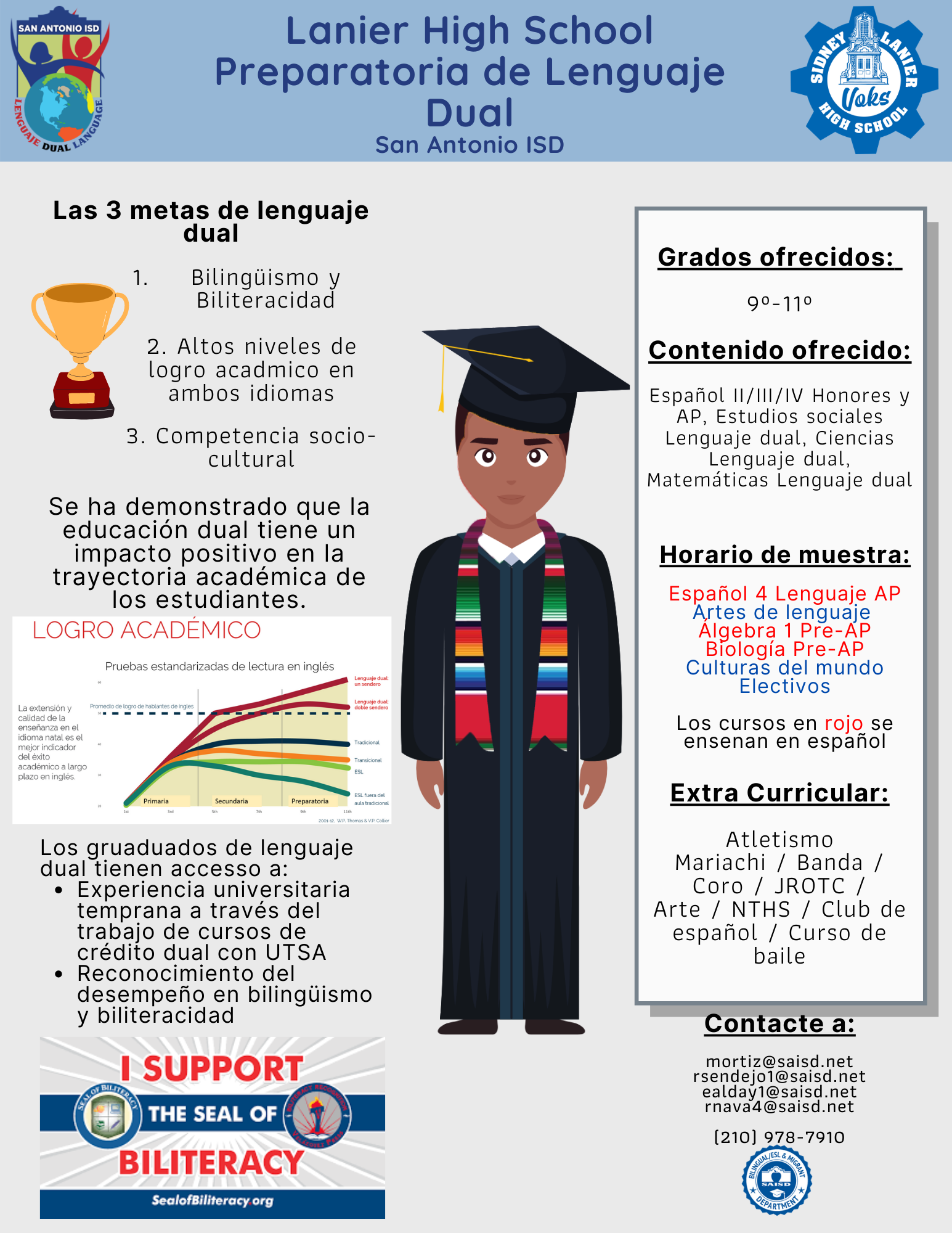 En Sidney Lanier High School, creemos en altas expectativas con fuertes apoyos estudiantiles, un clima de respeto y cuidado, aprendizaje riguroso, relevante y atractivo, y un ambiente de inclinación seguro y ordenado con intervenciones apropiadas que satisfagan las necesidades de los estudiantes. Nuestra asociación con la Universidad de Texas en San Antonio y St. Philip’s College brindará una oportunidad única para que los estudiantes se sumerjan en cursos avanzados, cursos universitarios, campamentos de verano y experiencias de pasantías.